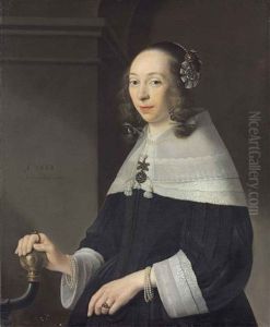 Portrait Of An Elegant Lady, Half-lenght, Said To Be Erminia Vanberesteyn , In A Black Dress With Fur Jacket, A'molensteen Kraag' And White Headdress With The Coat Of Arms Of The Gael And Beresteyn Family