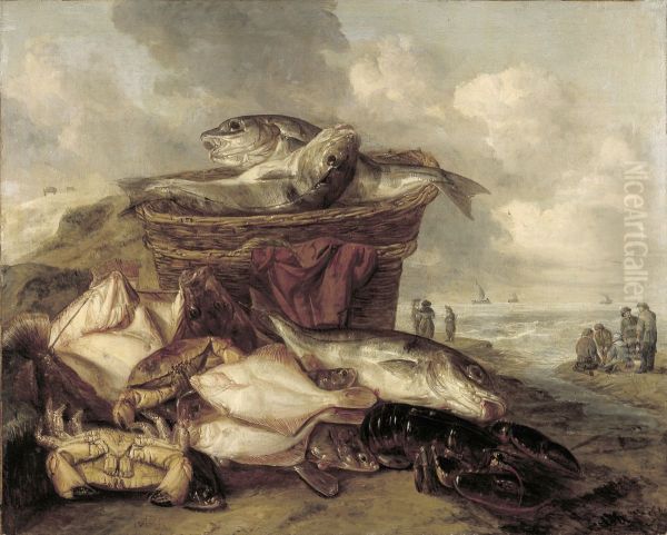 Stilleven met vis en twee manden op het strand