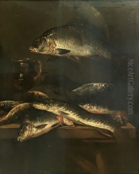 Visstilleven met zoetwater vissen op een tafel, met daarbij een kan en een vis aan haak daarboven