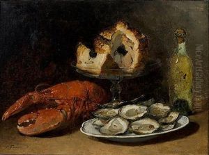 Stilleben Mit Einer Zinnkanne, Fruchten, Austern, Brot Und Wein Auf Einem Tisch
