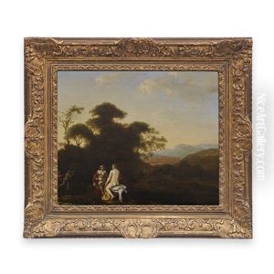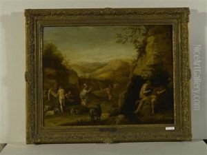 An Extensive Mountainous Landscape With Nymphs On A Bank, A Classical Dwelling Beyond