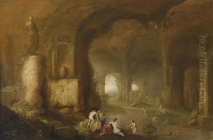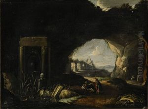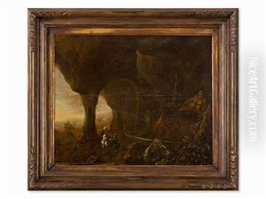 Felsgrotte Mit Antiken Ruinen, Rechts Lagernde Hirten, Im Hintergrund Ein Jagdreiter Mit Hunden Und Pfeil Und Bogen