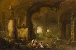 A Wooded River Landscape With Nymphs And Satyrs By A Capriccio Of Classical Ruins