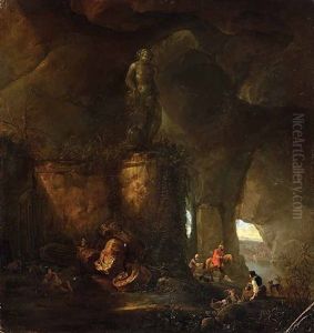 Eine Felsgrotte Mit Reisenden Und Einer Bacchusskulptur