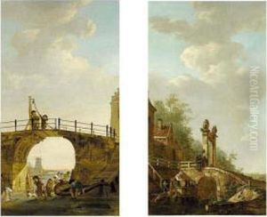 A Summer Landscape With A Woman Scouring Pots, Together With A Child And A Dog Near A Stone Bridge Over A Canal