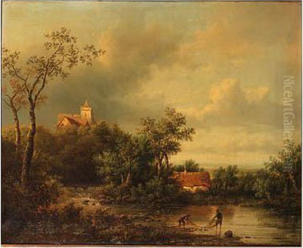 A Wooded Landscape With Fishermen Inspecting Their Nets On The Bankof A Creek, A Castle Beyond