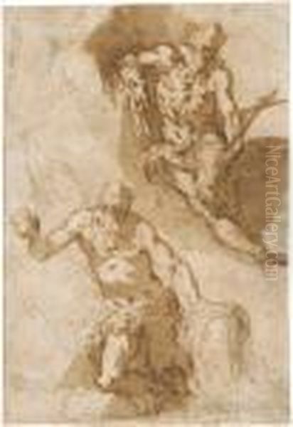 Zwei Studienfur Den Heiligen Hieronymus, Eine Mit Kreuz, Eine Mitstein