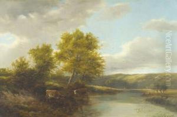 "on The Thames Near Streatley", Summer Landscape With Cattle Watering In The Foreground, Figures In A Punt Nearby And Hills Beyond Signed, Inscribed With The Artist's Name And His Exhibition Dates , Also Inscribed With The Title And The Date "1887