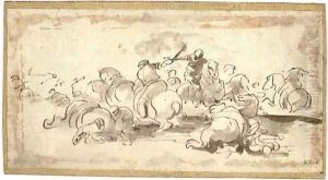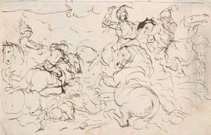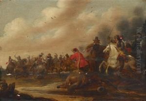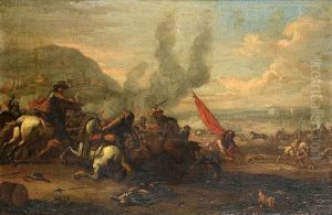 A Cavalry Skirmish In An Italianate Landscape With A Town Beyond