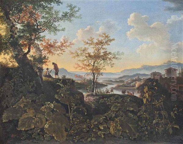 An Extensive River Landscape With Shepherds At Rest Oil Painting by Adam Pynacker