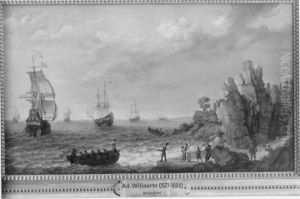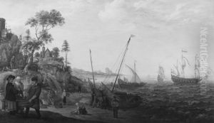 Zeegezicht met rotsachtige kust, vissers en schepen
