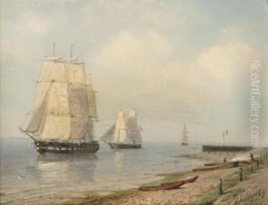 Ships Off The Coast Of Utrecht, With The Bijlhouwerstoren Tower On The Right