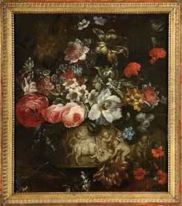 Vase A Decor De Feuilles D'acanthe Fleuri De Roses, Pivoineset Chevrefeuille, Pose Sur Un Entablement (2)