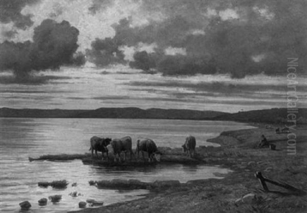 Abend Am Bodensee, Vorn Ein Huterbub Mit Kuhen Am Seeufer