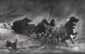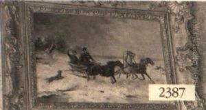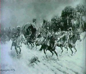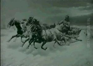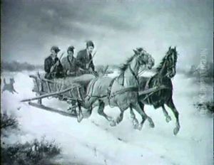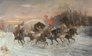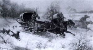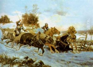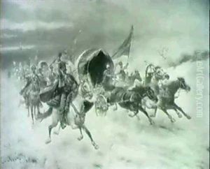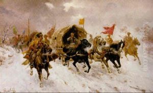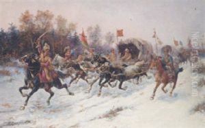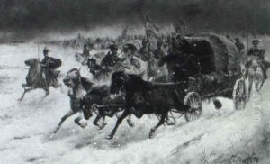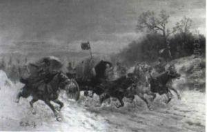Charging Wagons And Cavalry In A Winter Landscape
