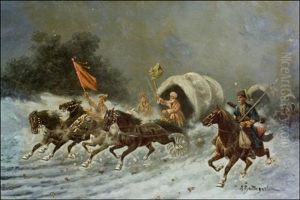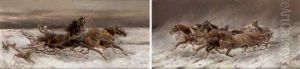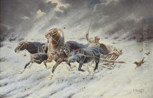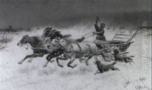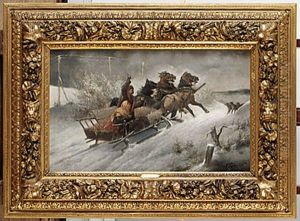 Bauer Im Pferdeschlitten In Rasender Fahrt In Verschneiter Landschaft
