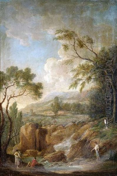 Idealisierte Campagnalandschaften Mit Wasserfallen, Figuren- Und Tierstaffage (pair) Oil Painting by Adolf Friedrich Harper