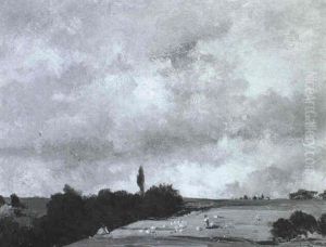 Sommerlandschaft Mit Weidenden Schafen Vorn, Ahrensammlerinnen Auf Dem Kornfeld Im Mittelgrund...