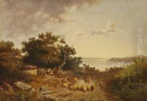 Schafer Mit Seiner Herde Im Schatten Einer Baumgruppe