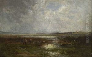 Oberbayrische Gebirgslandschaft Mit Zwei Bauern Im Abendlicht