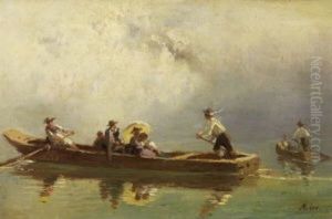 Drei Fischer In Einem Boot Auf Dem Aufgewuhlten Chiemsee