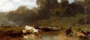 Hirte Mit Kuhen An Der Tranke Vor Einem Kirchdorf Im Abendlichen Bergland