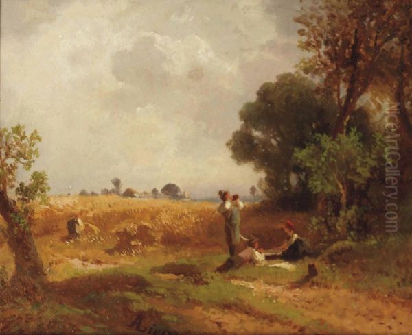 A Summer Landscape Wit Figures Resting By A Cornfield