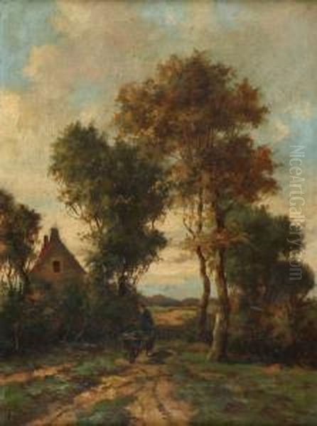 Boerenhofje Met Zandweg, Waarop Een Boer Met Kruiwagen