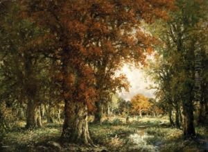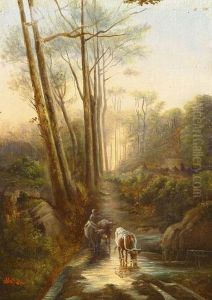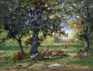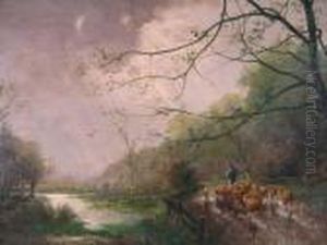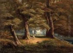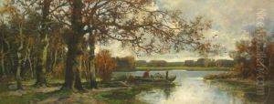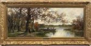 Rastende Reisigsammlerin Am Teich In Baumlandschaft.