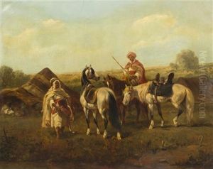 Rast Am Brunnen. In Einer Orientalischen Landschaft Sammeln Sich Reiter Und Ihre Lasttiere An Einer Wasserstelle