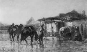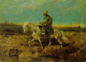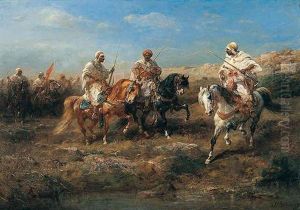 Three Armed, Elaborately Robed Arabs On Horseback Approaching Water