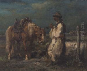 Ungarischer Bauer Mit Pferd Am Brunnentrog