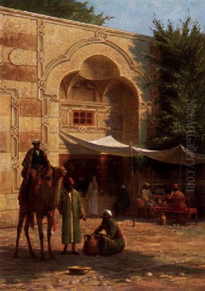 Orientalische Raststatte Mit Mannern Unter Sonnensegeln Beim Umtrunk, Kamelreiter Und Wassertrager Links