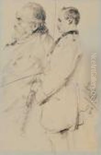 Studienblatt Mit Stehendem Mann Und Kopfstudie Eines Bartigen Herrn. Monogrammiert Und Datiert Unten Rechts: A.m./98. Bleistift, Gewischt, Auf Papier. H 18,2; B 12,1 Cm. Provenienz: Suddeutsche Privatsammlung.