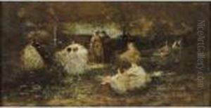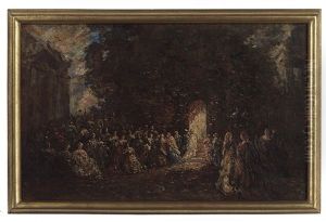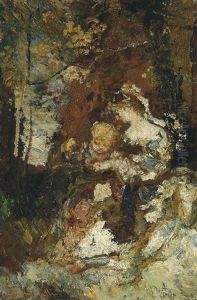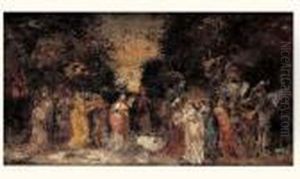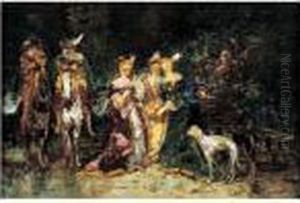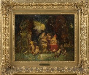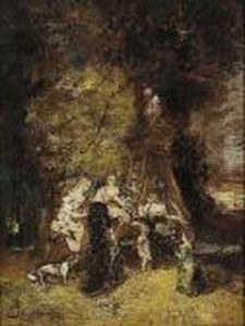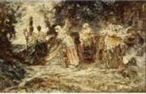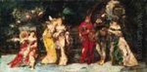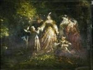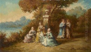Scene De Parc Avec Trois Courtisanes, Un Musicien Et Un Putti Huile Sur Toile