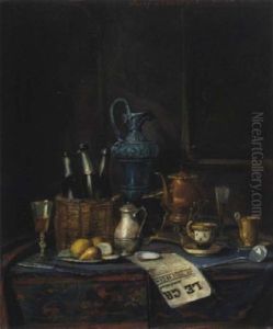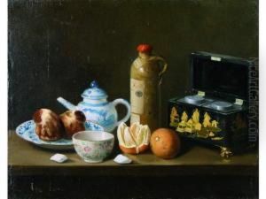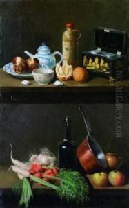 Nature Morte Aux Legumes. Nature Morte A La Boite A The, A La Bouteille De Loos Et Porcelaine De Paris.