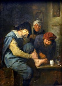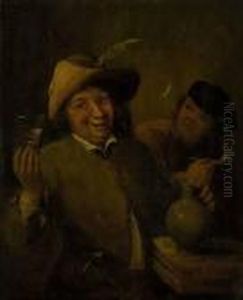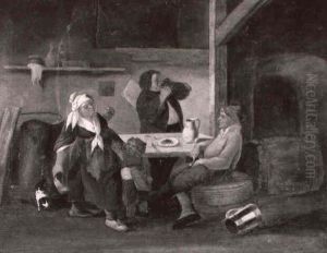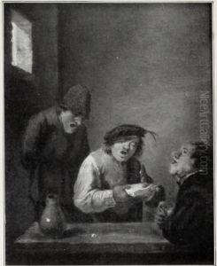 Three Merry Peasants Smoking In An Interior With Another Man Nearby