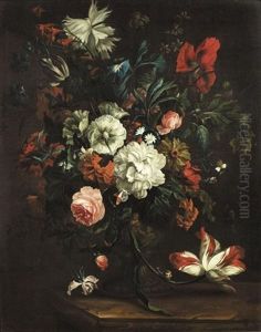 Still Life Of A Vine Twig With Grapes, Peaches, Apricots, Medlars, A Melon And A Halved Fig, Resting On A Stone Ledge