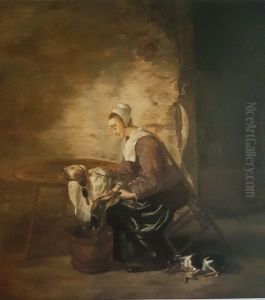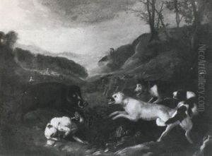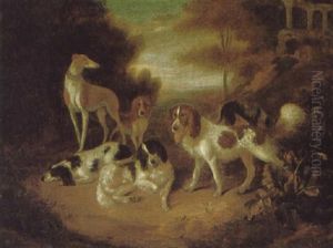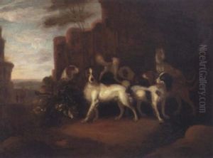 Wooded Landscape With Spaniels, A Huntsman Beyond
