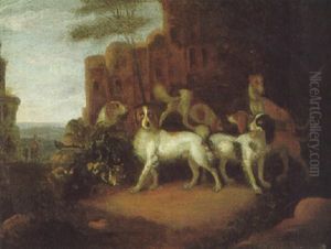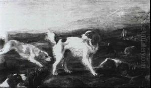 Hounds Staking Out The Hiding Place Of A Rabbit (+ A Hunter With His Dog Near A Ruined Church; 2 Works)