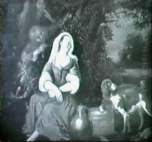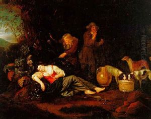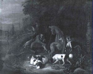A Wooded Landscape With Hunters And Their Dogs Gathered Round A Sleeping Maiden