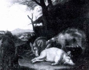 A Hunting Still Life With Dogs Guarding Their Prey, A Hunter Walking On A Path In The Background