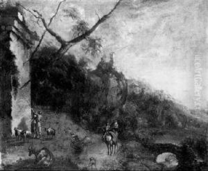 An Italianate Wooded Landscape With Figures By A Waterfall