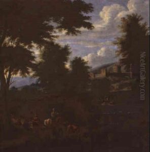 Wooded Landscape With A Traveller And His Mule Appraoching A Village