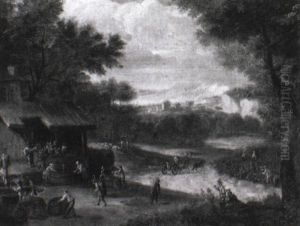 A Herdsman And His Companion At A Ford, A Village Beyond