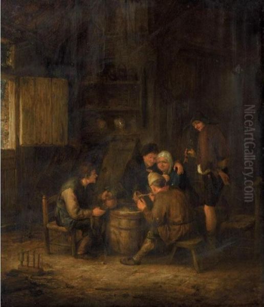 An Interior With Peasants Huddled Around A Cask, Smoking And Drinking