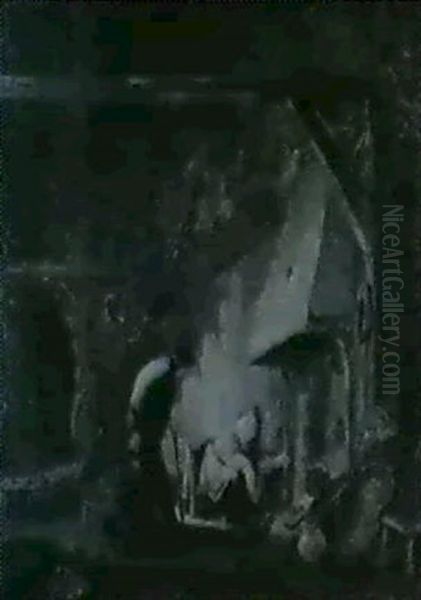 Bauerninterieur Mit Offenem Kamin, Vor Dem Eine Alte Frau Sitzt Und Sich Mit Einem Nebemihr Stehenden Auf Einem...