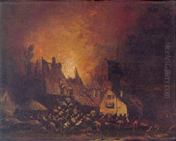 A Village At Night With Numerous Figures Fleeing From A Burning House