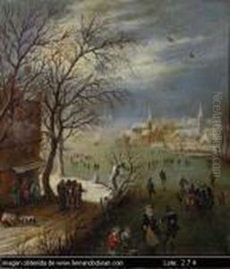 A Winter Landscape With Elegant Figures Conversing On A Path And Skating On The Ice, A Fortified Town Beyond