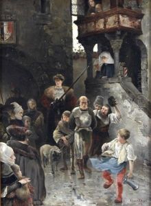 Figures Brawling In A Road, With Onlookers
